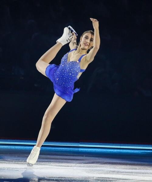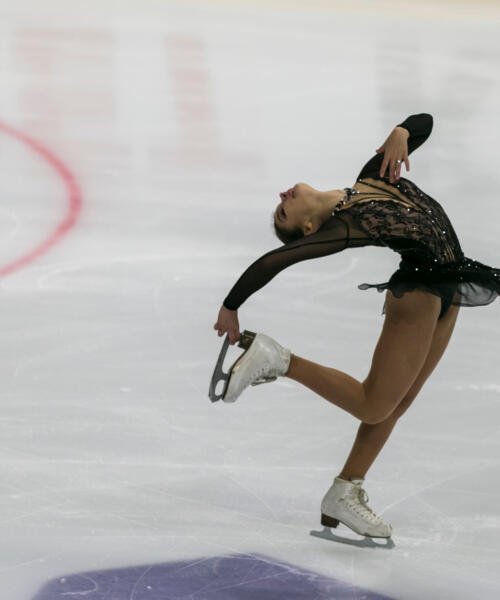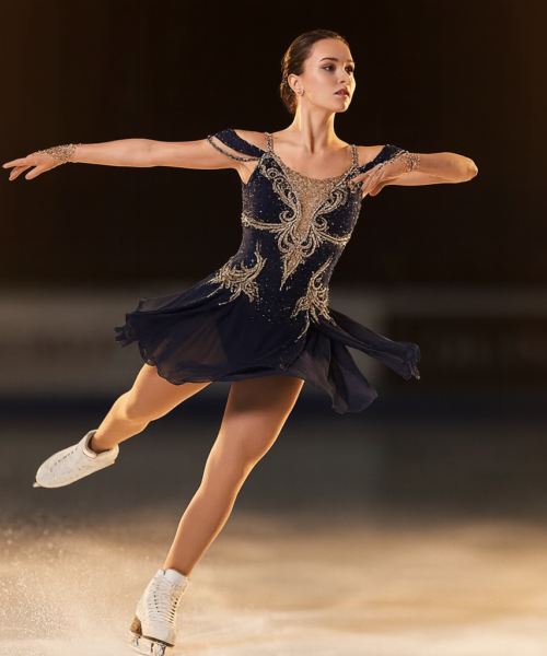 Una selezione di foto reali delle nostre atlete in gara, per mostrare come i capi BluLight si comportano sul ghiaccio: luminosità, vestibilità, stabilità e resa scenica sotto i riflettori.